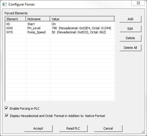 Forces dialog is invoked by the Debug-> Configure Forces menu item