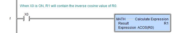 The expression parameter consists of all the text between the bounding parentheses. Any expression parameter can be a constant value, a bit or numeric memory location, an arithmetic expression, and/or mathematical function or other expressions up to a maximum of 1024 characters. Expressions can be nested, so use of parentheses is recommended to ensure proper evaluation order.