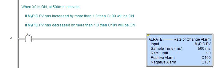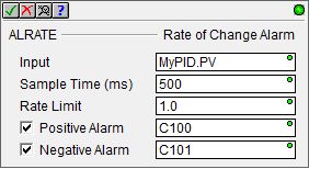 The Rate of Change Alarm instruction (ALRATE) monitors the Input at the specified Sample Time and sets one or both of the designated alarm bit locations if the Input has changed more than the Rate Limit. |