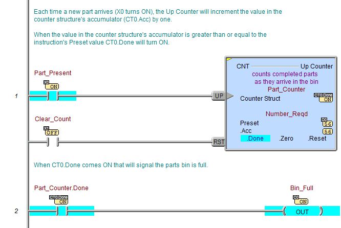 The Up Counter (CNT) instruction is a two input counter that counts from 0 up to the Preset value. Each time the UP input logic transitions from OFF to ON the counter structure's accumulator (.Acc) is incremented by one. The counter structure's .Done bit will turn ON once the .Acc value reaches the Instruction's Preset value.