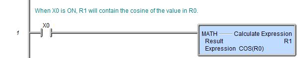 The expression parameter consists of all the text between the bounding parentheses. Any expression parameter can be a constant value, a bit or numeric memory location, an arithmetic expression, and/or mathematical function or other expressions up to a maximum of 1024 characters. Expressions can be nested, so use of parentheses is recommended to ensure proper evaluation order. The range of acceptable input values is any real or integer number. Angles expressed in degrees must first be converted to radians with the RAD - Convert Degrees to Radians instruction, for example, if the angle R1 is in degrees use COS( RAD( R1 ) ). |