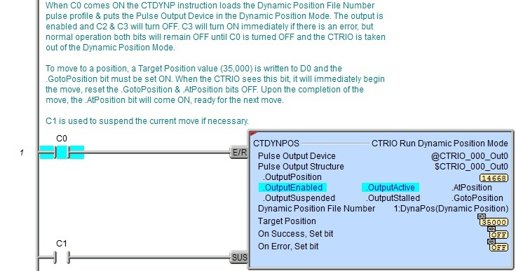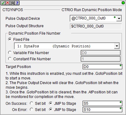 The CTRIO Run Dynamic Position Mode (CTDYNPOS) instruction is used to select and load a one of the pre-configured Dynamic Position or Dynamic Position Plus Profiles in the System Configuration for the CTRIO, and put the Pulse Output Device into Dynamic Position Mode, allowing successive moves to be easily commanded. Once in Dynamic Position Mode, moves are commanded by changing the Target Position value and setting (one-shot) the .GotoPosition bit for the Pulse Output Device. The moves will execute using the parameters defined in the specified profile.