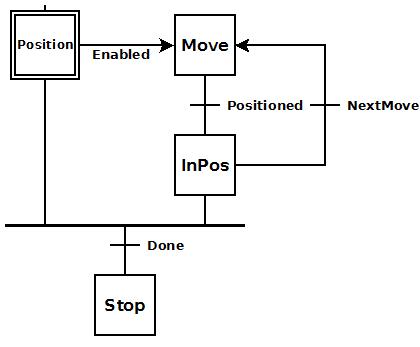 The InPos stage waits for either the NextMove or the Done bits. If this was the last move, then the Done bit converges both the Position and InPos stage and transitions to the Stop stage. If this was not the last move, then another position is given and the NextMove bit transitions back to the Move stage.