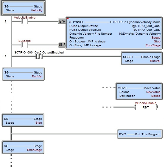 In the RunVel stage should exist the ladder logic (not shown here) that would write various velocity values to the Speed variable as the process requires (e.g. using a MOVE instruction to move a value from NewValue to Speed as shown). As soon as a new value is written to the Speed variable, the CTRIO will accelerate/decelerate to the new velocity. When the process is deemed as complete RunVel stage should reset VelocityEnable bit OFF (as shown) observing the cautions in the above Note.