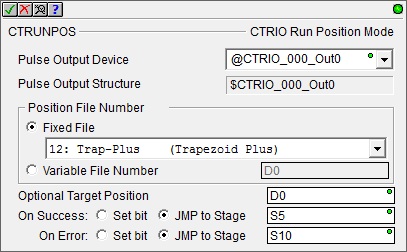 The CTRIO Run Position Mode (CTRUNPOS) instruction is used to load and run one of the pre-configured Pulse Profiles in the System Configuration for the CTRIO.