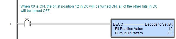 The Decode to Set Bit instruction (DECO) will set the bit at the specified Bit Position Value ON, and all of the other bits will be set OFF.