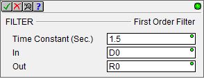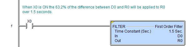 The First Order Filter (FILTER) instruction performs a continuous filtering operation on the input value. This operation applies 63.2% of the difference between the In value and the Out value to the Out value over the duration of the Time Constant.