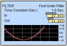 When the ladder status is ON (Debug-> All Status On), in addition to the standard status values being displayed, the 1st Order Filter instruction also displays a small trend that shows the instruction's values graphically.