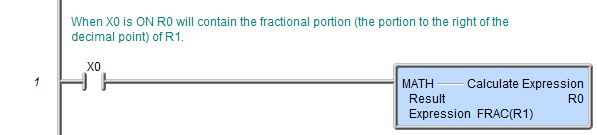 The Fractional Portion of a Real Number (FRAC) instruction returns only the fractional portion of a Real number, that is, the portion to the right of the decimal point. Negative real numbers return negative values.