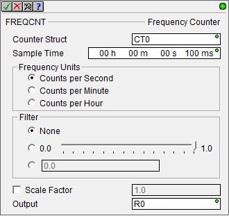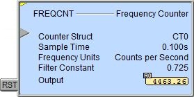 The second input leg is the Count Reset (RST). When this input logic is ON, the Frequency Counter's output value will be set to 0.0.
