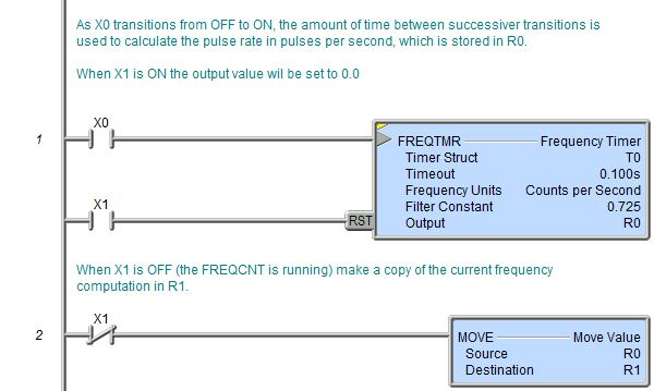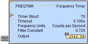 The Frequency Timer (FREQTMR) instruction is used to convert the rate of a series of pulses to engineering units by measuring the time between the leading edges of successive pulses, normalizing that value to the desired time base, then scaling that value to the desired engineering units. This type of scaling is typically done for speed, flow rate, velocity, etc..