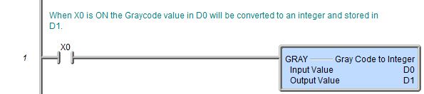 The Gray Code to Integer instruction (GRAY) converts a 16 bit Gray code value to an integer value. This instruction is designed for use with devices that use the gray code numbering scheme.