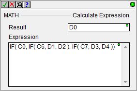 The 3-parameter If / Else Expression (IF) math function evaluates the first parameter to determine which of the following two parameters to process. If the first parameter is non-zero (TRUE, ON) the Result will be the value of the second parameter, If the first parameter is zero (FALSE, OFF) the Result will be the value of the third parameter.