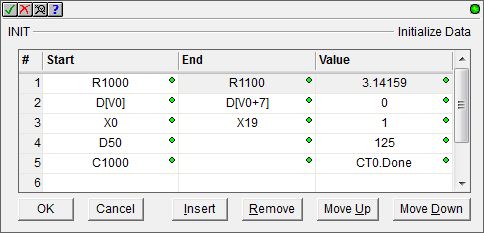 Ladder Display:The ladder display for the Initialize Data instruction will show all of the rows of the instruction. |