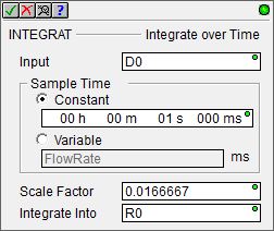 Scale Factor - specifies a scale factor that will be applied during the integral calculation. This can be any constant value or any readable numeric location. Normally this value is calculated based on the time units of the Input, and the desired units of the Integrate Into parameter.