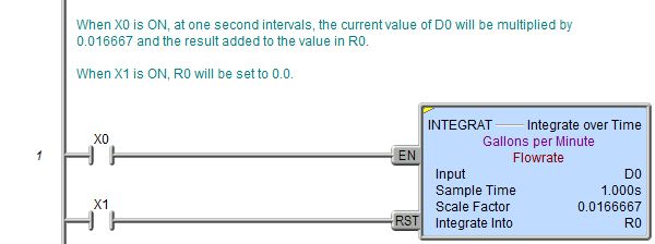 The Integrate Over Time (INTEGRAT) instruction is used accumulate the value of the specified input location (this is typically a rate value) at a specified time interval. A typical example where this instruction is used flow meters where the number of rotations of the rotor is counted by a pulse transmitter and converted to volume and flow rate.