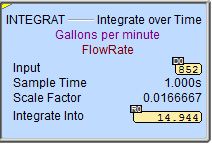 The calculation performed at each Sample Time is: Integrate Into = Integrate Into + (Input * (current Sample Time in seconds) * Scale Factor).