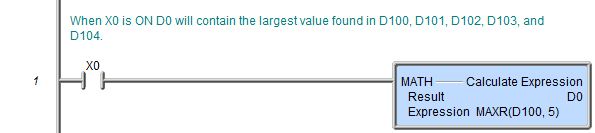 The Maximum Value Across a Range of Values (MAXR) instruction determines the maximum value in the specified range of variable locations. This function has two parameters separated by a comma as follows: