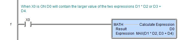 The parameter list consists of all the text between the bounding parentheses. The parameter list must consist of 2 parameters separated by a comma. Each parameter is an expression which can be a constant value, a bit or numeric memory location, an arithmetic expression, and/or mathematical function or other expressions up to a maximum of 1024 characters. Expressions can be nested, so use of parentheses is recommended to ensure proper evaluation order.