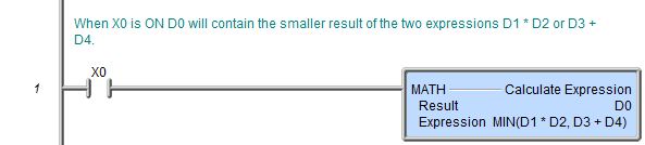 The expression parameter consists of all the text between the bounding parentheses. The parameter list must consist of 2 parameters separated by a comma. Each parameter is an expression which can be a constant value, a bit or numeric memory location, an arithmetic expression, and/or mathematical function or other expressions up to a maximum of 1024 characters. Expressions can be nested, so use of parentheses is recommended to ensure proper evaluation order.