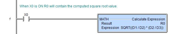 Expression - contains the memory locations, mathematical operators, and/or math functions from the following tables that make up the formula to calculate. This can be any valid combination of constant values, bit or numeric memory locations, math operators, nested parentheses, and math functions up to a maximum of 1024 characters. Expressions can be nested up to 8 levels deep and chained between operators within function parameters, and as array indices, so use of parentheses is recommended to ensure proper evaluation order.