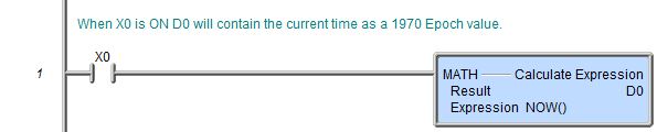 The Get Date/Time as a 32-Bit Integer (NOW) instruction returns a 32-bit integer value that represents the number of seconds since January 1, 1970, this is known as a 1970 Epoch value. This value is a 32-bit integer which should be stored in a DWord location.