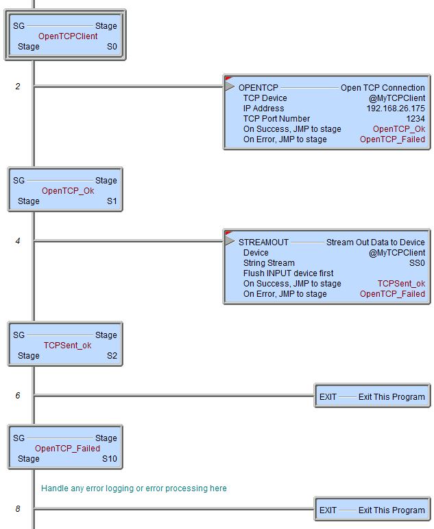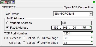 The Open TCP Connection (OPENTCP) instruction is used to create a TCP Client connection to a TCP Server.
