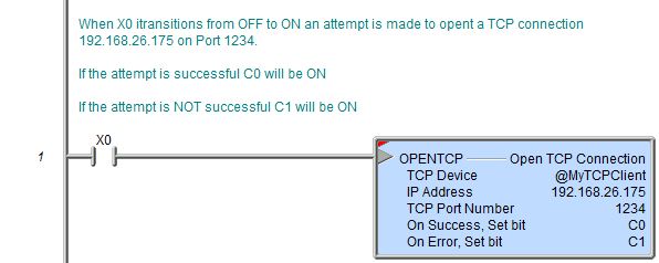 Note: Open TCP Connection (OPENTCP) is NOT used to communicate via Modbus/TCP protocol. This instruction is used to implement a custom protocol over a TCP/IP connection. Use the built-in Modbus/TCP Client instructions Modbus Network Read (MRX) and Modbus Network Write (MWX) to communicate via Modbus/TCP protocol.