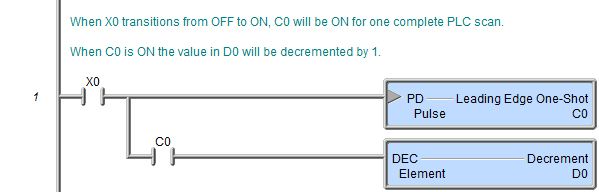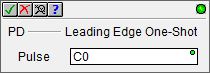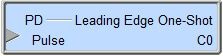 Inputs:The standard Leading Edge One-Shot (PD) has one ladder logic input. The gray triangle at the right end of an input leg indicates this input is edge-triggered, meaning that each time this input logic transitions from OFF to ON, the Pulse bit location will be ON for one complete controller scan.