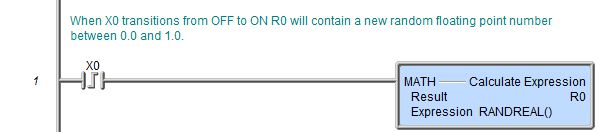 The Random Real Number (RANDREAL) instruction is a pseudo-random number generator that produces a floating point number of uniform distribution between 0.0 and 1.0