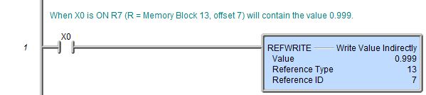 The Write Value Indirectly (REFWRITE) instruction writes the specified value to the bit or numeric location in the Do-more controller (structure elements are not supported).