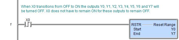 When the input logic is ON, the Reset Range (RSTR) instruction turns OFF all of the specified discrete memory locations within the specified range. When the input logic is OFF, the discrete memory locations in the range are not affected. |