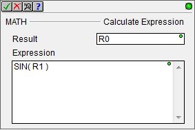 The range of acceptable input values is any real number. Angles expressed in degrees must first be converted to radians with the RAD - Convert Degrees to Radians instruction, for example, if the angle R1 is in degrees use SIN( RAD( R1 ) ).