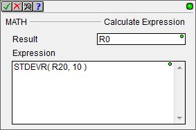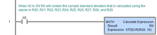 Note: If the second parameter (Range) exceeds the size of the data block , the result will be calculated using the values up to the last variable in the block and ST132 (Argument Out of Range) will be ON. For example, assume the block of WX locations has a range of WX0 to WX255. The result of STDEVR(WX250, 10) would be the Sample Standard Deviation of the 6 values in WX250 through WX255, and ST132 (Argument Out of Range) will be ON.