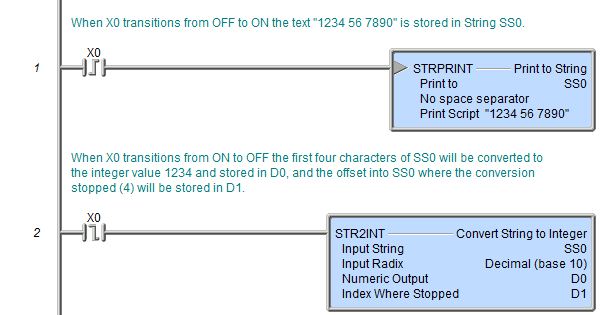 The Convert String to Integer (STR2INT) instruction is used to convert the contents of the specified input string from ASCII text to an integer value. Any leading whitespace characters will be automatically skipped.