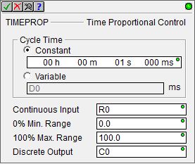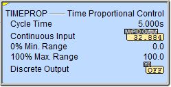 The time proportioning control must match the resolution of the Continuous Input (typically 0% to 100%). For example, when using PID .Output values the range would be 0.0 to 100.0, and for 12-bit analog inputs the range would be 0 to 4095. The following two fields allow for adjusting the scale factor: