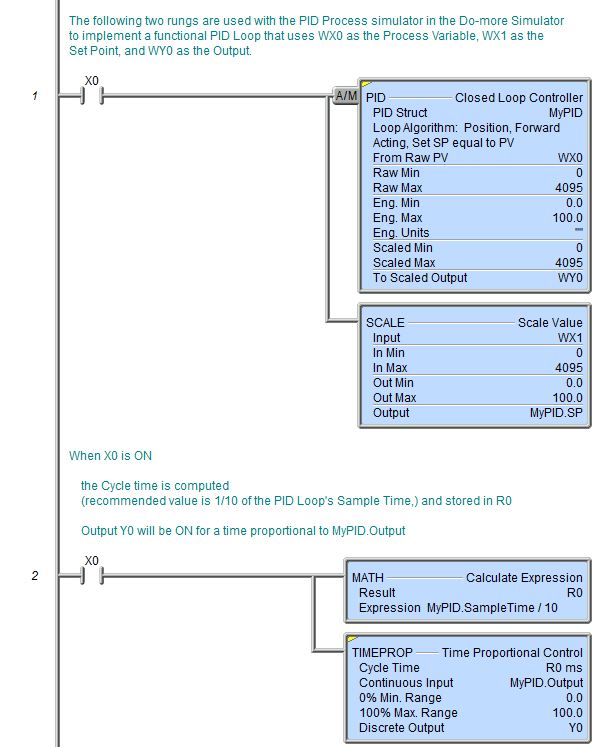 The Closed Loop Controller (PID) instruction generates a smooth control output signal across a numerical range, typically 0% to 100%. This is called continuous control because the output is at some level continuously. PID control is applied in an ON/OFF control system by adding a time base within the controller. For each preset time interval, the Cycle Time, the controller will proportion the ON and OFF time depending on the magnitude of the output and the PID tuning values selected.