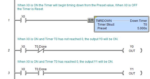 The Down Timer (TMRDOWN) has a single ladder logic input leg which both enables and resets the Timer. If the input logic is ON, the Down Timer will begin timing down from the Preset value. When the input logic is OFF, the Timer is reset and the Timer's accumulator value is set to the Preset value.