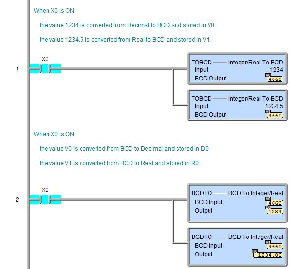 The Integer/Real To BCD (TOBCD) instruction is used to convert a positive Integer or Real (floating point) value to a BCD (binary coded decimal) value.