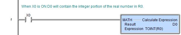 The Convert to Integer (TOINT) function will convert the input real number to an integer. The value will not be rounded. The range of acceptable input values is any positive or negative real number.