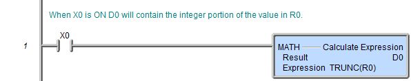 The expression parameter consists of all the text between the bounding parentheses. Any expression parameter can be a constant value, a bit or numeric memory location, an arithmetic expression, and/or mathematical function or other expressions up to a maximum of 1024 characters. Expressions can be nested, so use of parentheses is recommended to ensure proper evaluation order.