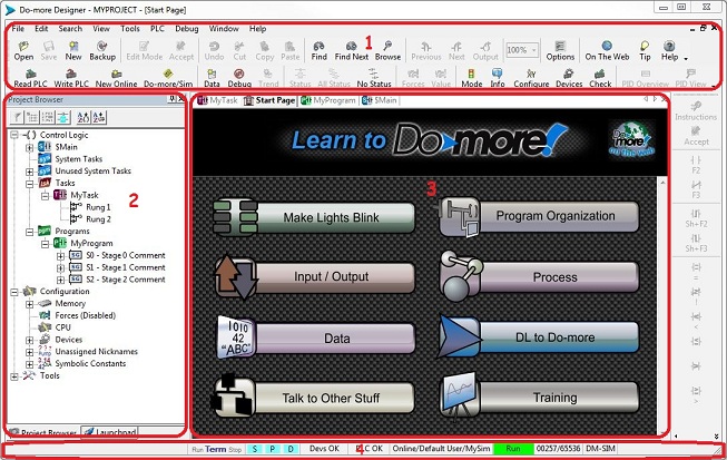 The default layout of the Do-more Designer Programming software main screen is divided into the following main areas (numbered 1 through 4 in the picture below):