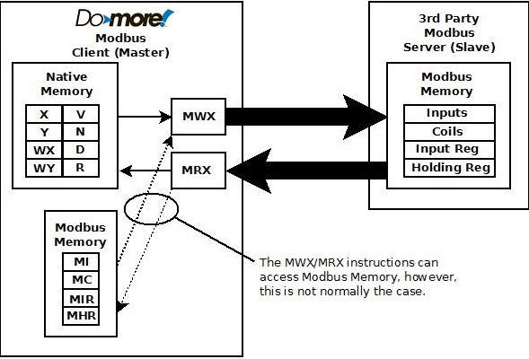 As stated above, when operating as a Modbus Client, using the MRX - Modbus Network Read and MWX - Modbus Network Write instructions have access to all of the native memory as well as the Modbus memory. And while it is possible to use the MC, MI, MHR, MIR memory locations as destination registers for MRX instructions, and as source registers for MWX instructions, in most cases it is not advisable to do so because that memory is reserved for use by the Modbus Server.