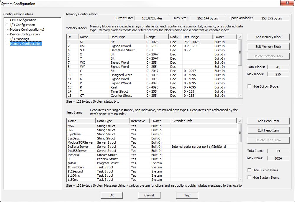User-defined Memory Blocks must be created before they can be used in a Do-more Designer project. User-defined heap items can be created during an editing session. Creating new Memory Blocks, changes to existing memory blocks, and creating new Heap Items make changes to the system configuration. The System Configuration CANNOT be downloaded to the controller while it is in RUN mode. The controller will need to be placed in Program mode while the new system configuration is downloaded. Creating the heap items before they are referenced in the project will preserve the ability to perform run-mode edits.