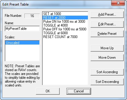 The Edit Preset Table dialog is where a preset table is created and/or edited.