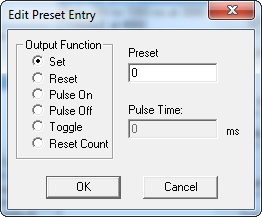 To create (or edit) an entry, pick one of the Output Functions from the box and enter a value for the Preset (and Pulse Time if necessary). |
