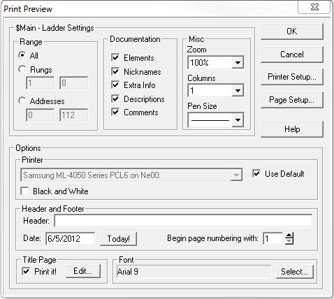 The Print Preview dialog can be used to see how the ladder logic in